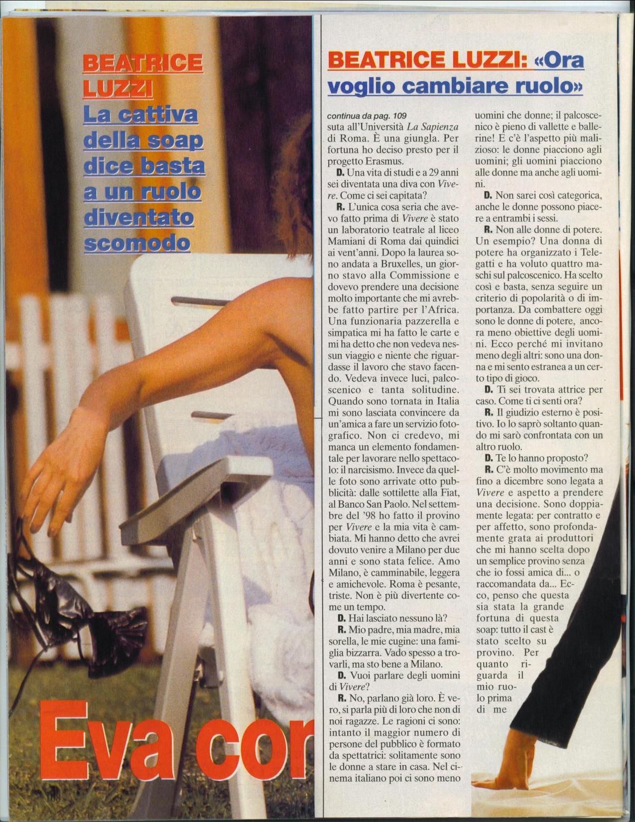 Io ne soffrii non poco perché il mio personaggio era alquanto scomodo: la povera Eva la facevano litigare quasi tutti i giorni con gli altri personaggi... le sorelle, i genitori, i vari amanti (me ne affibbiarono assai:).